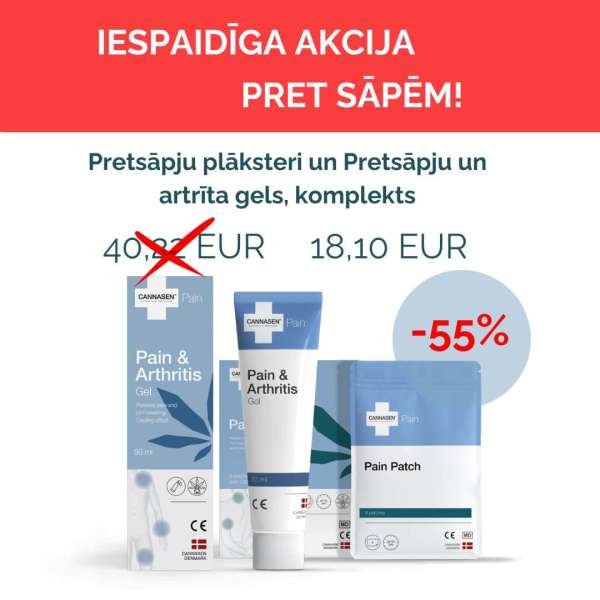 Komplekts sāpju mazināšanai locītavu iekaisuma, pietūkuma un muskuļu sāpju gadījumā.- CANNASEN® Pretsāpju plāksteris un CANNASEN® Pretsāpju un artrīta gels, pērc kopā par īpaši izdevīgu cenu.